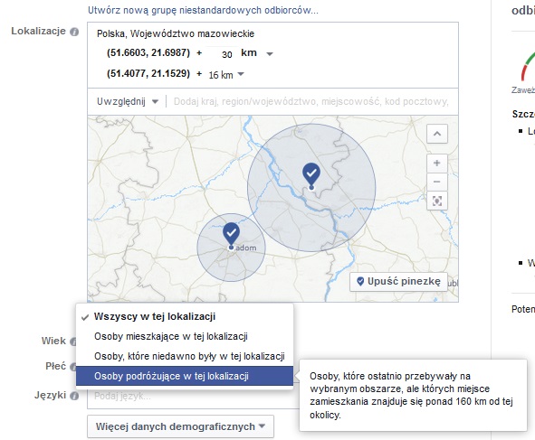 Jak widzisz można wybrać dowolnie obszar wokół każdej naszej pinezki (nad mapą, pokazuje nawet bardzo konkretne współrzędne geograficzne). I tak jak wspomniałem powyżej jest możliwość wyboru czy zależy ci na osobach odwiedzających dane miejsce, czy tylko mieszkańcach.
