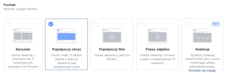 Jeśli jednak zdecydujesz się na tworzenie własnej kreacji to Facebook ma dla Ciebie kilka ciekawych formatów: