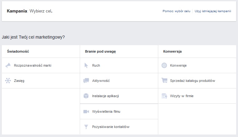Kampanie – w hierarchii jest to najważniejsza klamra spinająca nasze działania płatne w menadżerze reklam. Na tym poziomie decydujemy (po wciśnięciu przycisku utwórz kampanie w lewym, górnym rogu) o celu całej kampanii. Obecnie cele zostały podzielone na 3 kategorie. Poniżej pokrótce omówię najważniejsze i te, z których będziecie najczęściej korzystać.